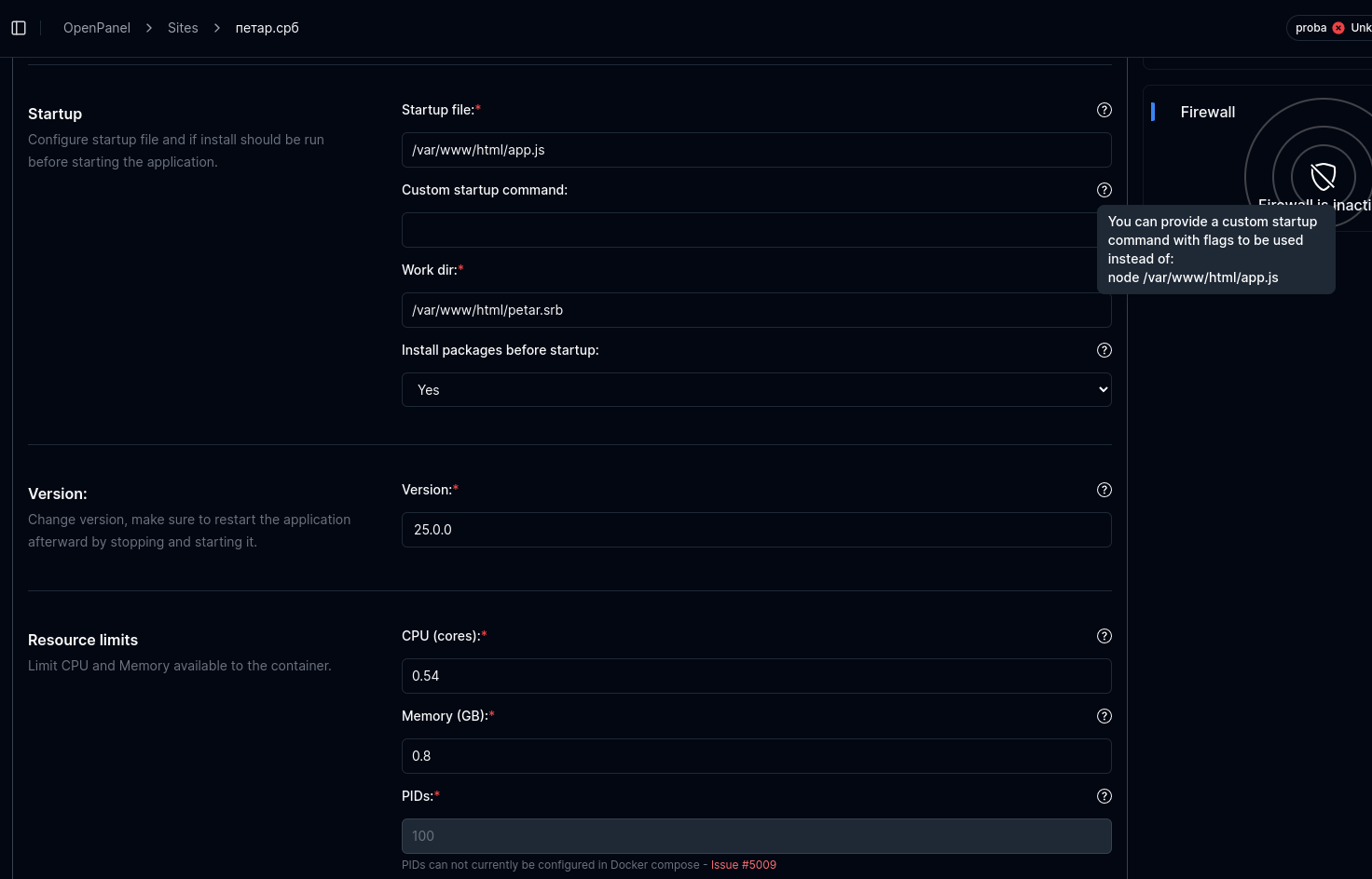 oprencli imunify installcommand to display errors and abort if imav service install failed (unsupported os or CPU by Imunify). - Option to add a custom startup command for Node apps #733