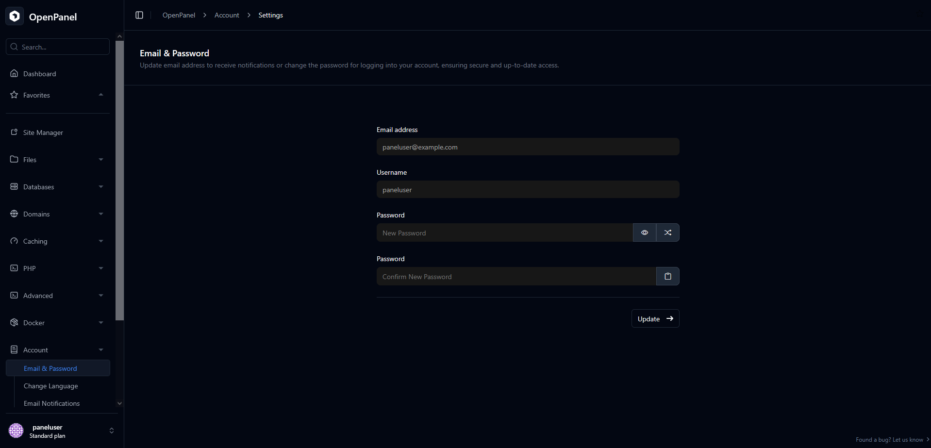 OpenPanel offers a unique feature that allows you to change your username, unlike standard control panels that require hosting support for such modifications.
